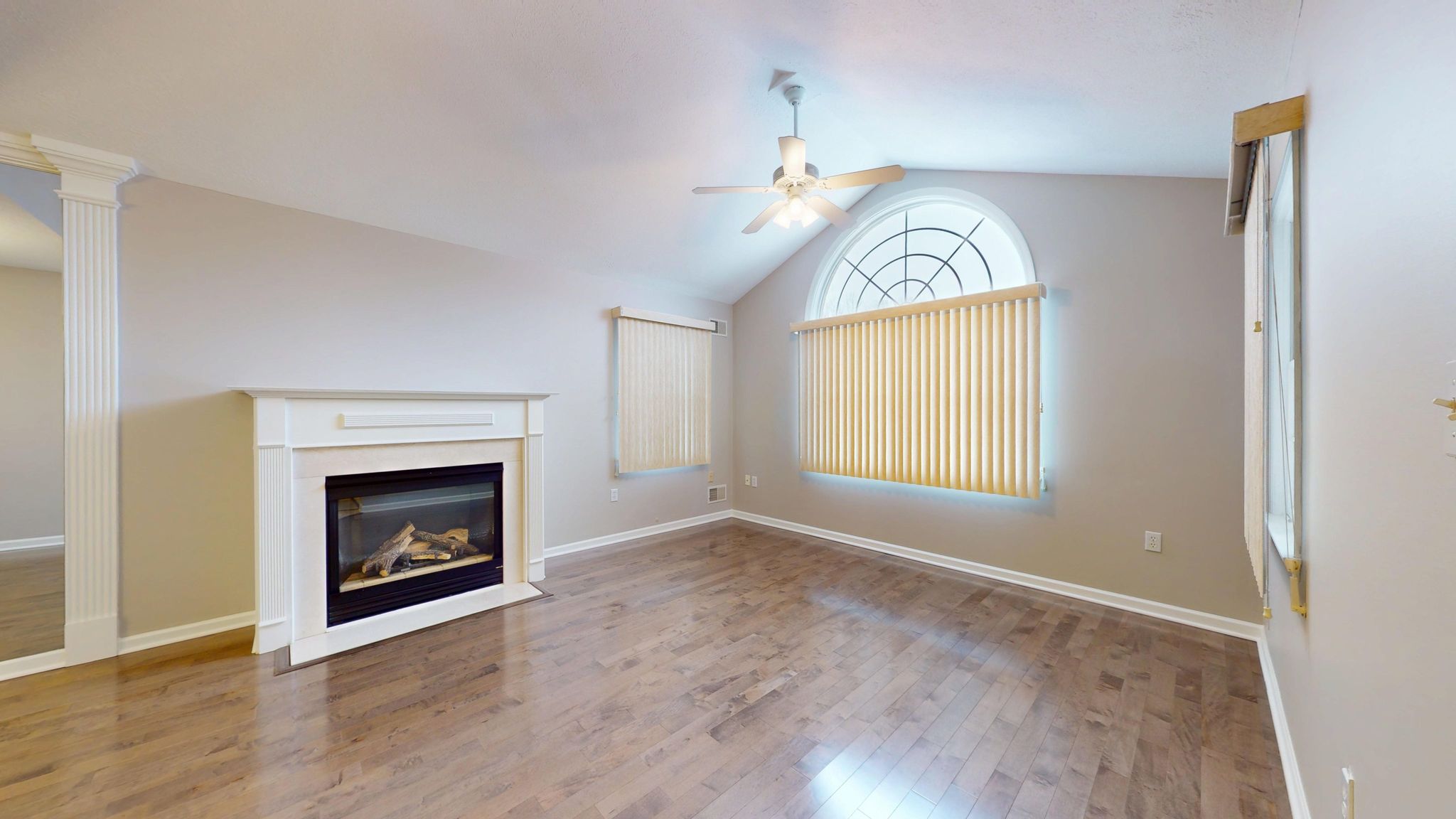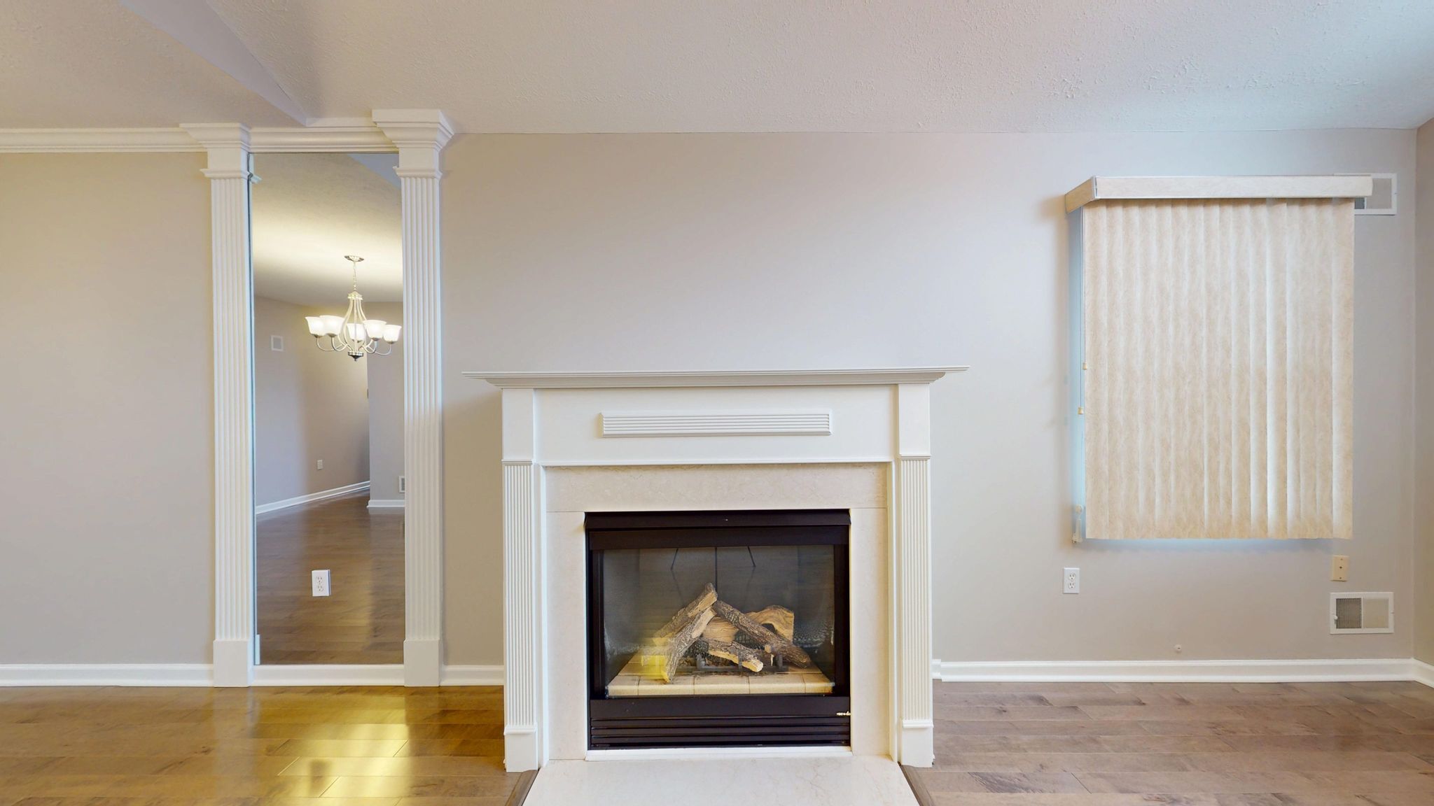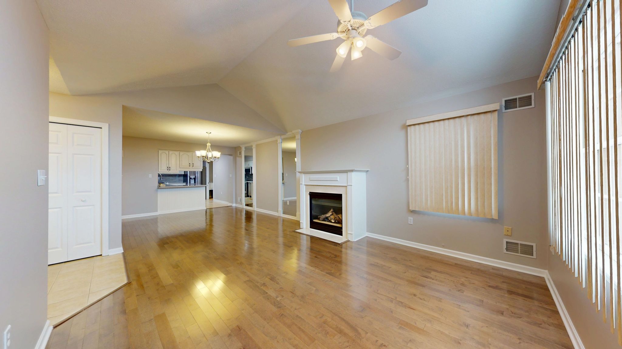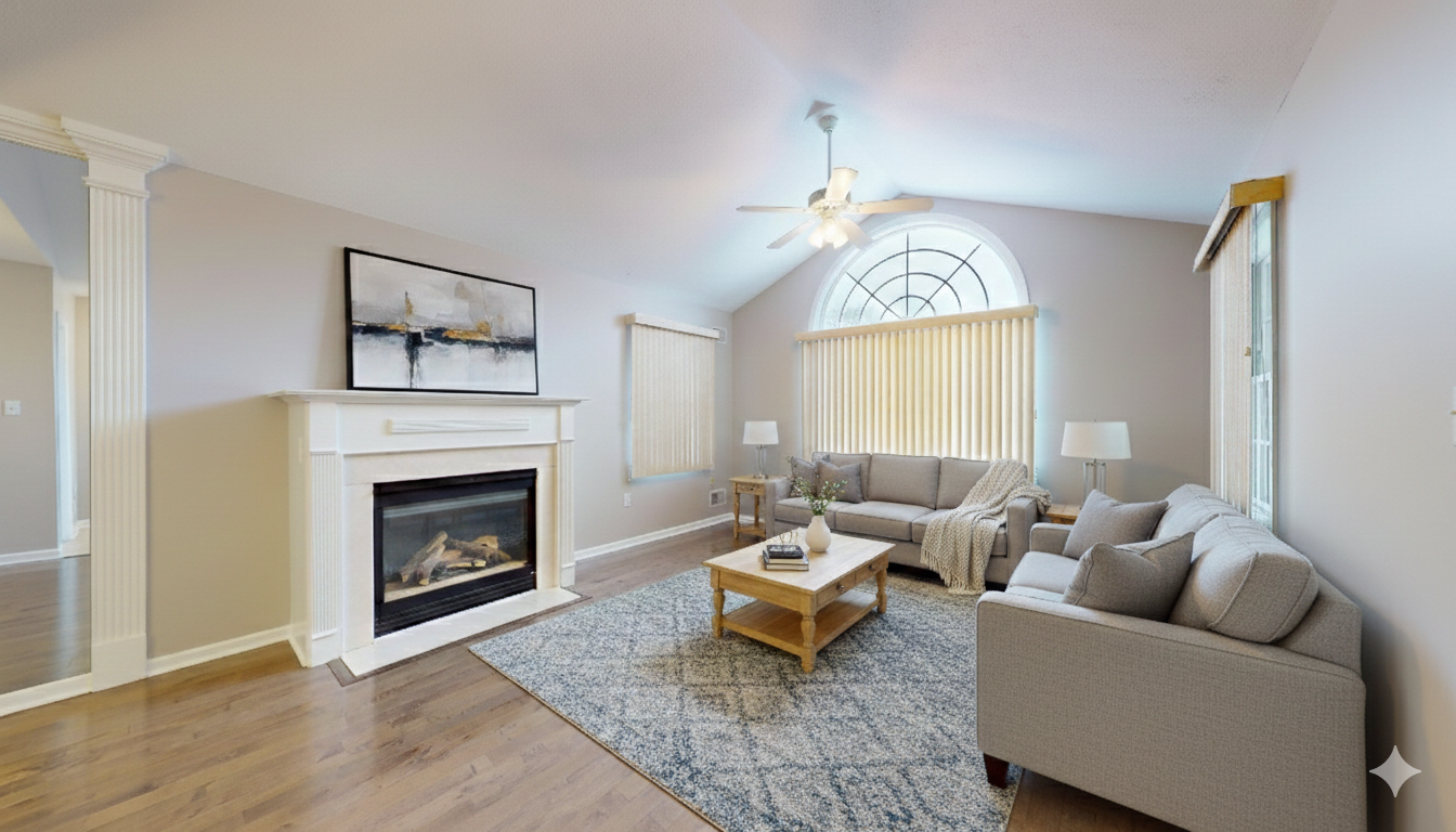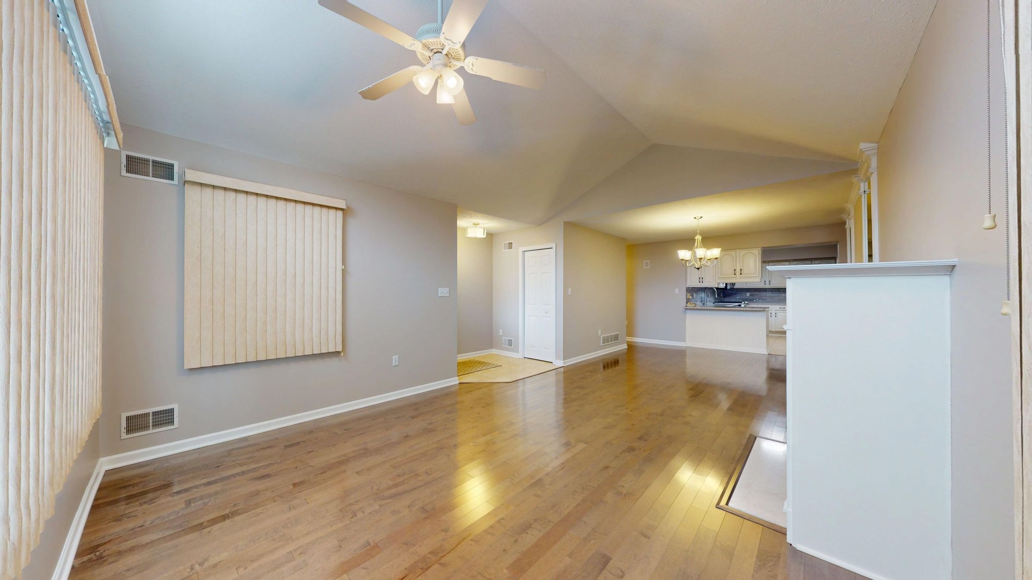 Inside, the home unfolds with an airy, open-concept layout enhanced by vaulted ceilings, rich hardwood flooring, decorative columns, and a cozy fireplace that anchors the main living space. The natural flow between the living room, dining area, and kitchen creates an ideal setting for both quiet evenings and effortless entertaining. Large windows invite natural light throughout, while recent updates including fresh paint and new carpeting add to the crisp, move-in-ready feel.