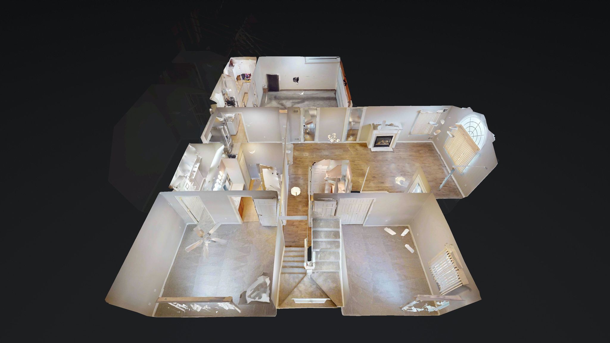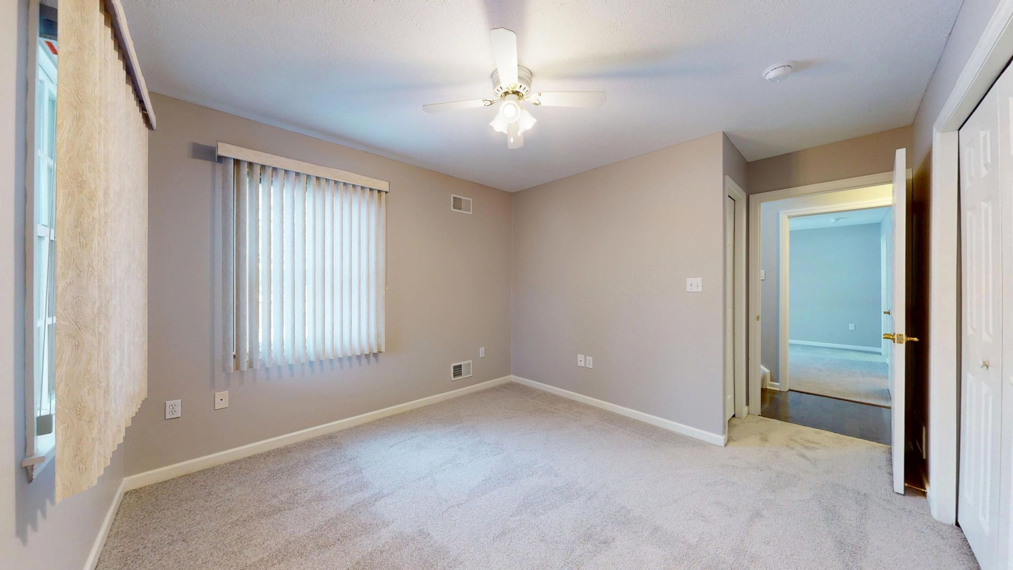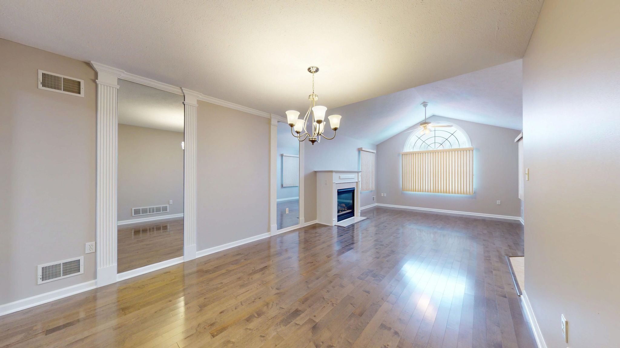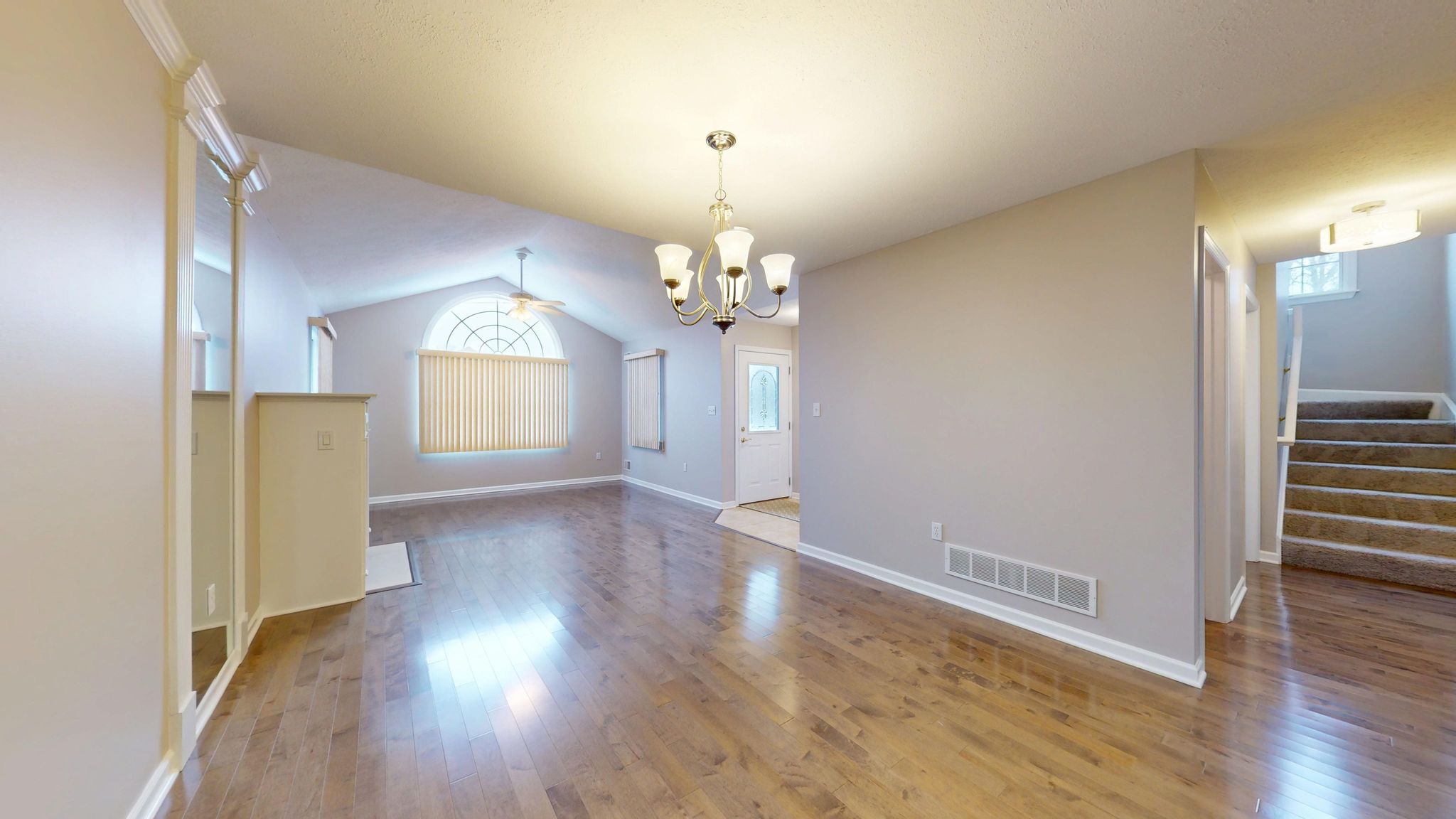 Inside, the home unfolds with an airy, open-concept layout enhanced by vaulted ceilings, rich hardwood flooring, decorative columns, and a cozy fireplace that anchors the main living space. The natural flow between the living room, dining area, and kitchen creates an ideal setting for both quiet evenings and effortless entertaining. Large windows invite natural light throughout, while recent updates including fresh paint and new carpeting add to the crisp, move-in-ready feel.