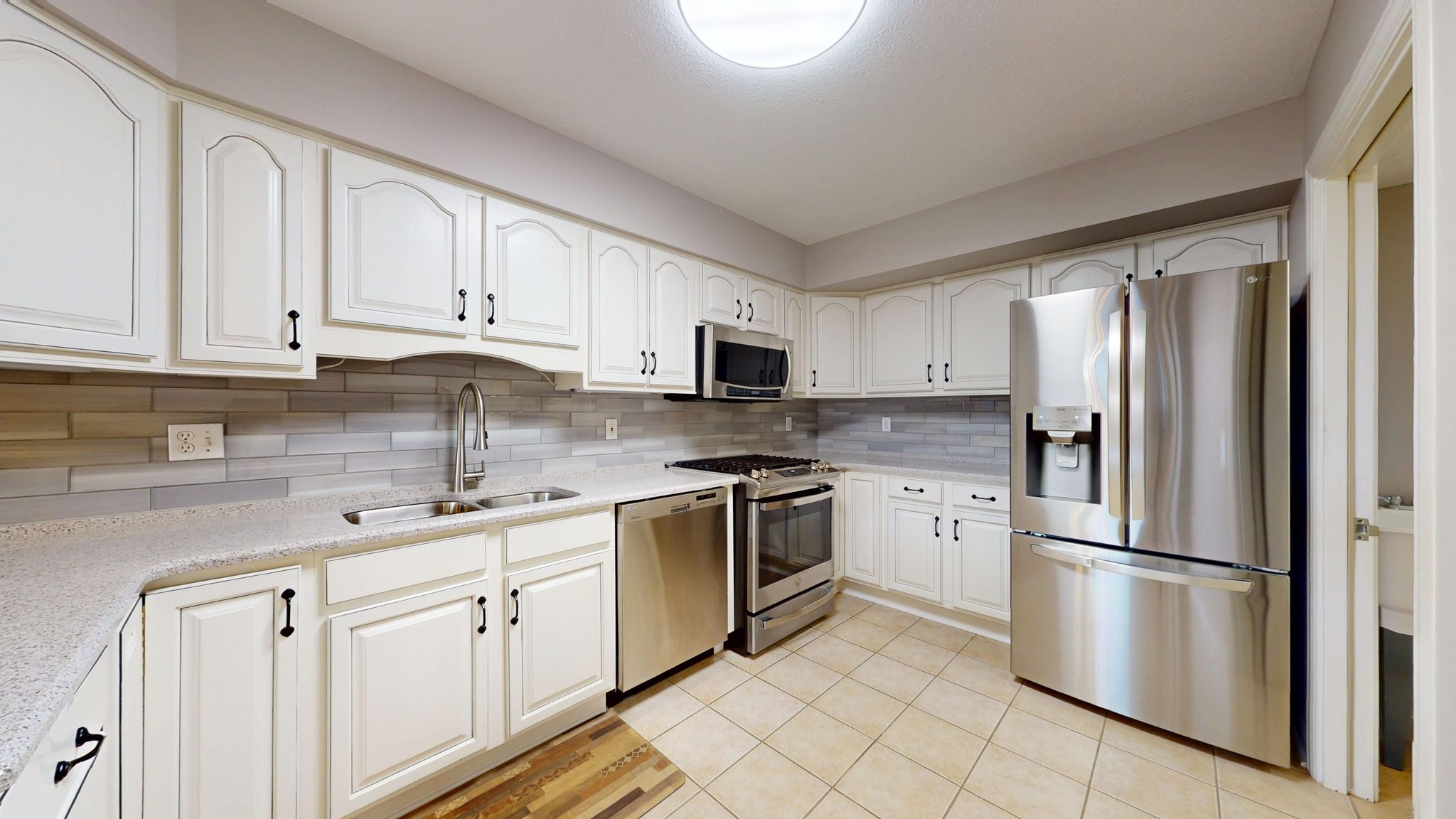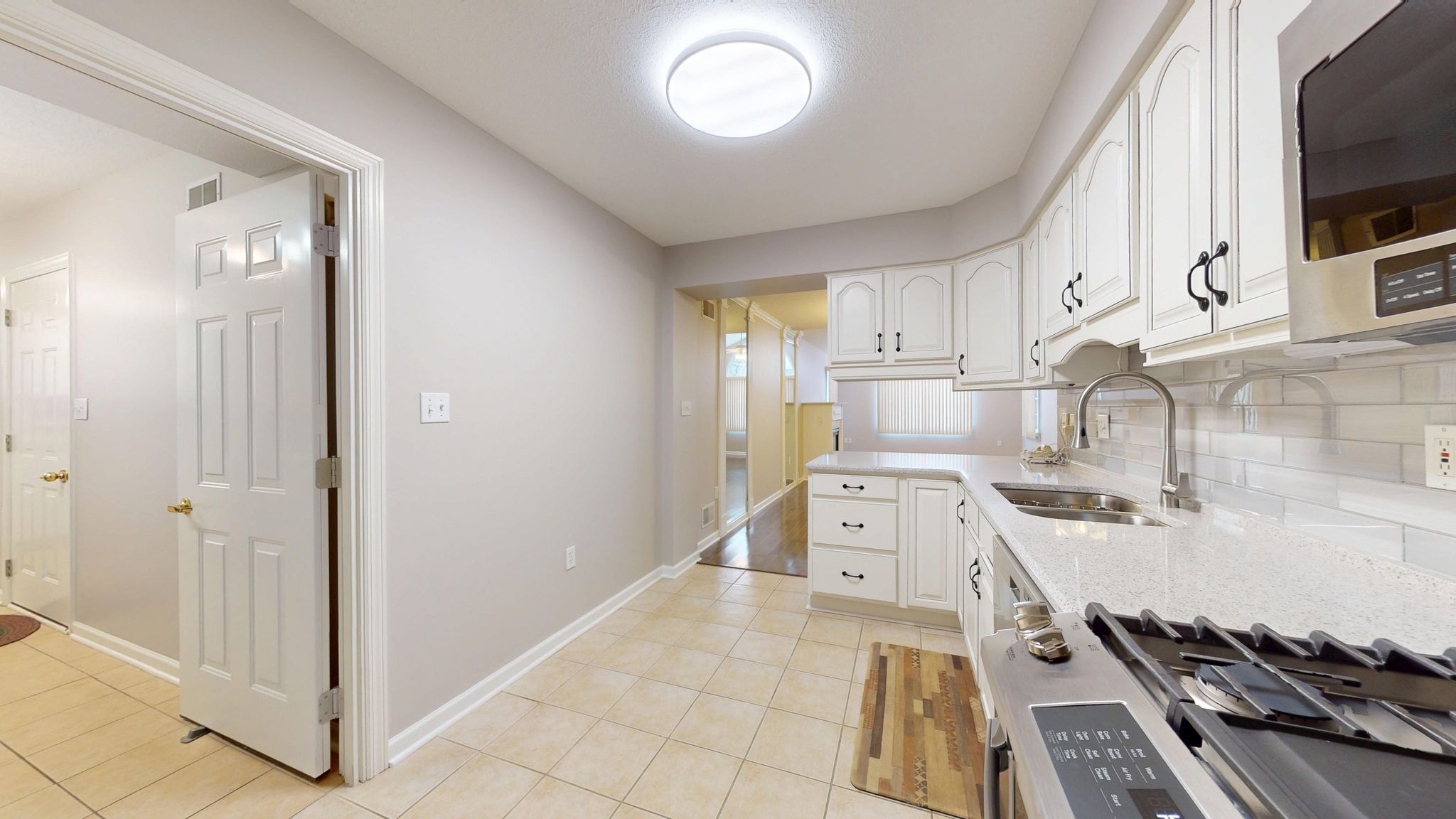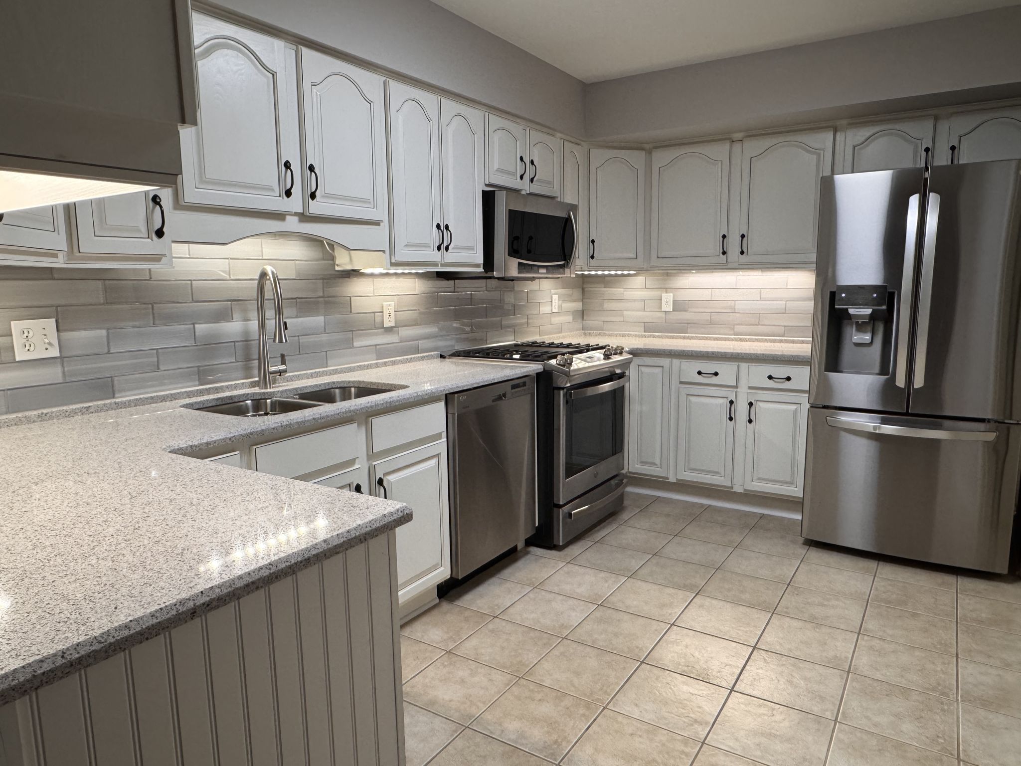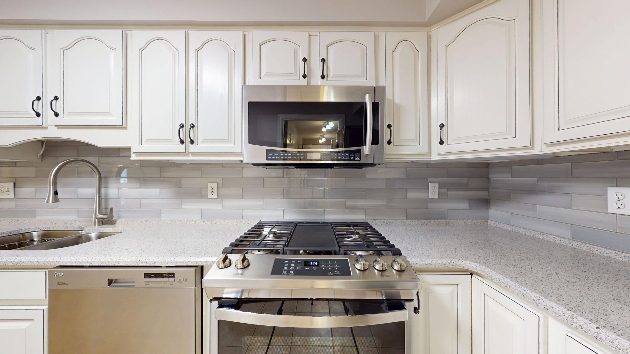The updated kitchen combines timeless style with thoughtful functionality. Antique white cabinetry, quartz countertops, a glass subway tile backsplash, and stainless steel appliances create a clean, polished aesthetic. Under-cabinet lighting highlights the finishes, while full-extension pull-out drawers, Lazy Susan corner shelving, and Rev-A-Shelf pull-down storage systems maximize accessibility and organization. The five-burner gas range with center griddle and convection oven offers versatility for everyday meals or special gatherings.