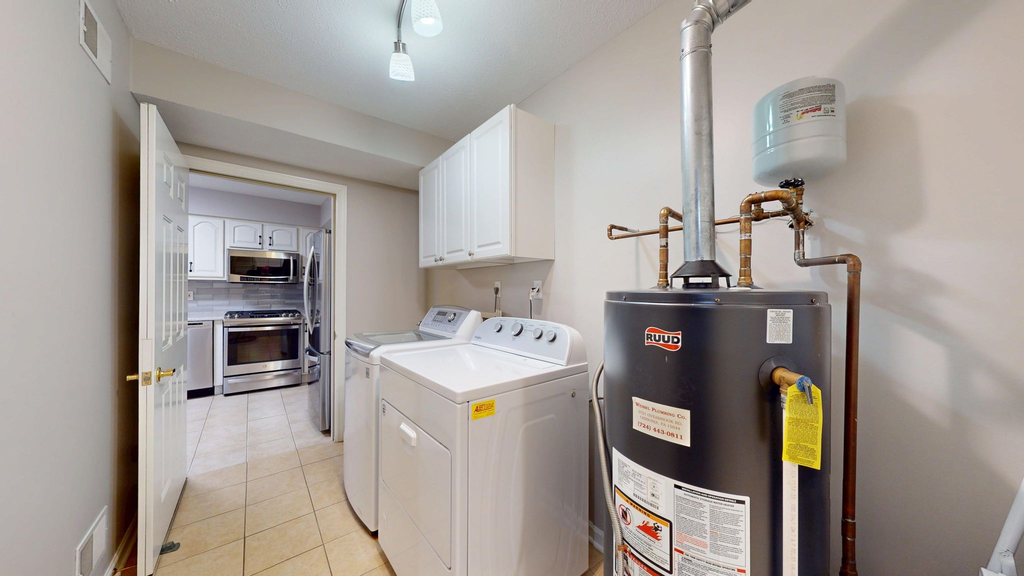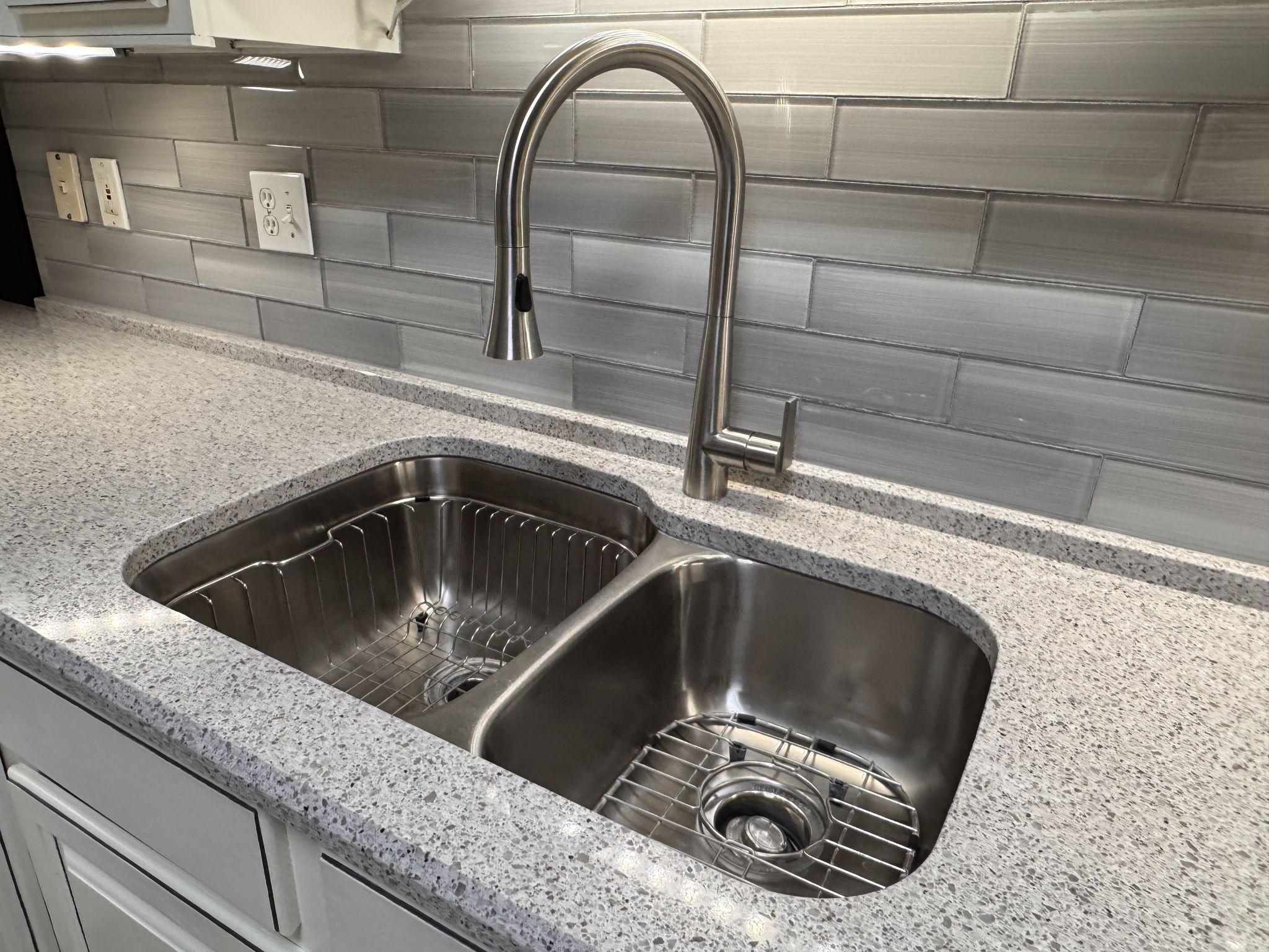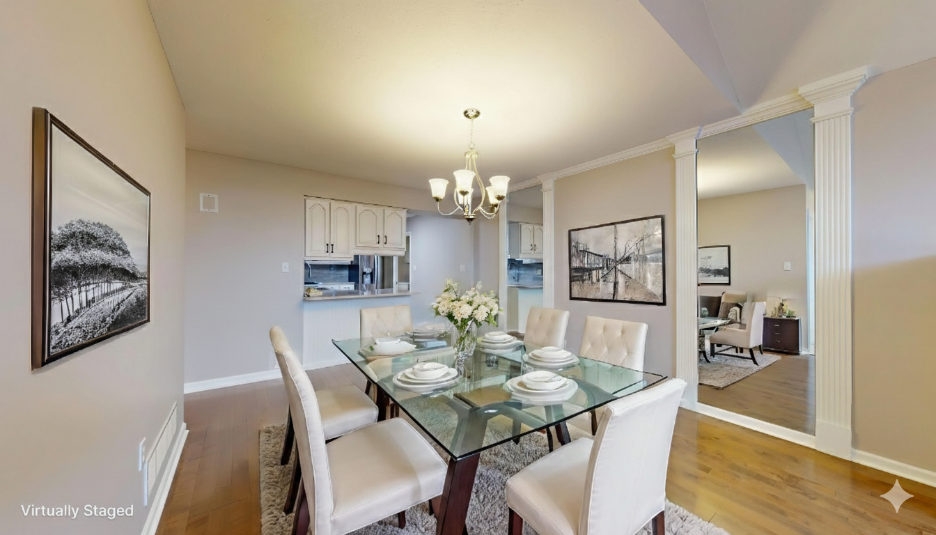 The updated kitchen combines timeless style with thoughtful functionality. Antique white cabinetry, quartz countertops, a glass subway tile backsplash, and stainless steel appliances create a clean, polished aesthetic. Under-cabinet lighting highlights the finishes, while full-extension pull-out drawers, Lazy Susan corner shelving, and Rev-A-Shelf pull-down storage systems maximize accessibility and organization. The five-burner gas range with center griddle and convection oven offers versatility for everyday meals or special gatherings.