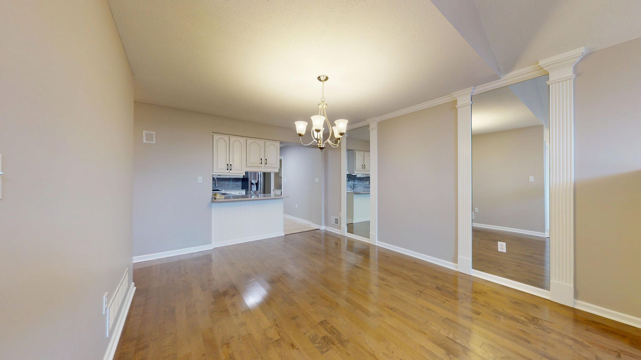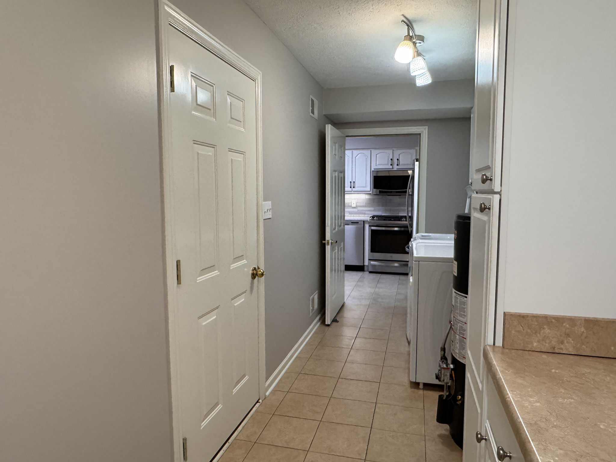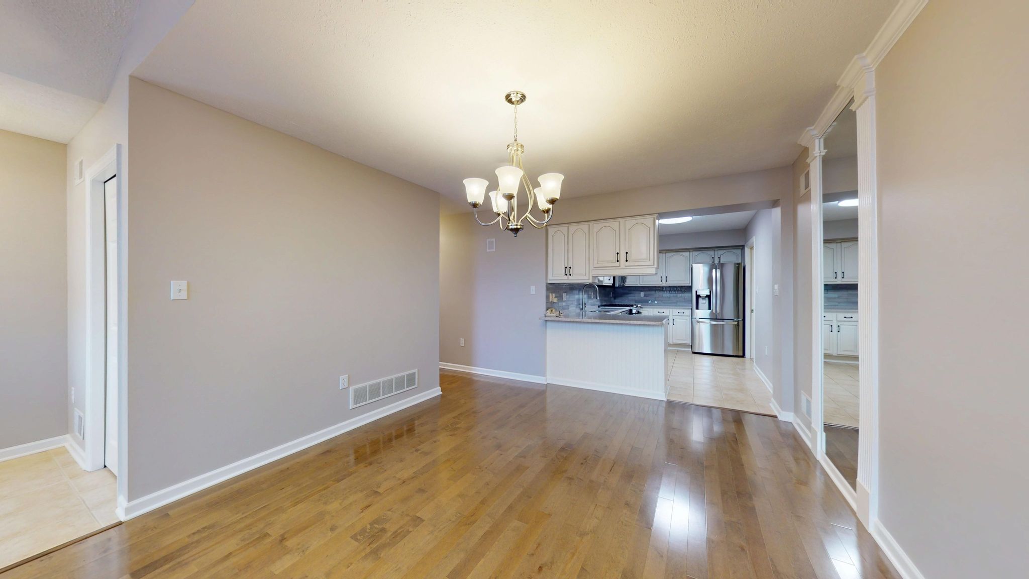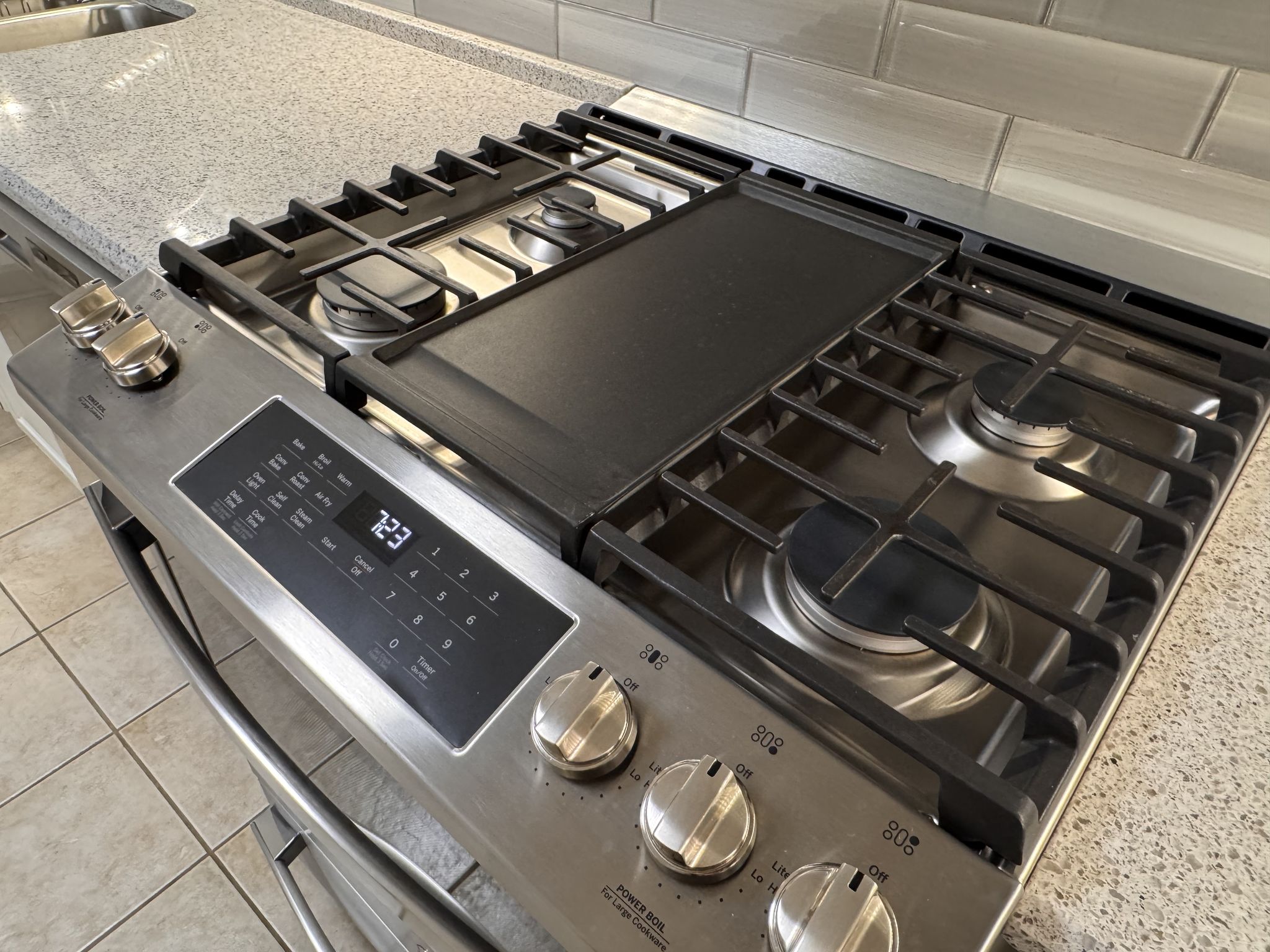 The updated kitchen combines timeless style with thoughtful functionality. Antique white cabinetry, quartz countertops, a glass subway tile backsplash, and stainless steel appliances create a clean, polished aesthetic. Under-cabinet lighting highlights the finishes, while full-extension pull-out drawers, Lazy Susan corner shelving, and Rev-A-Shelf pull-down storage systems maximize accessibility and organization. The five-burner gas range with center griddle and convection oven offers versatility for everyday meals or special gatherings.