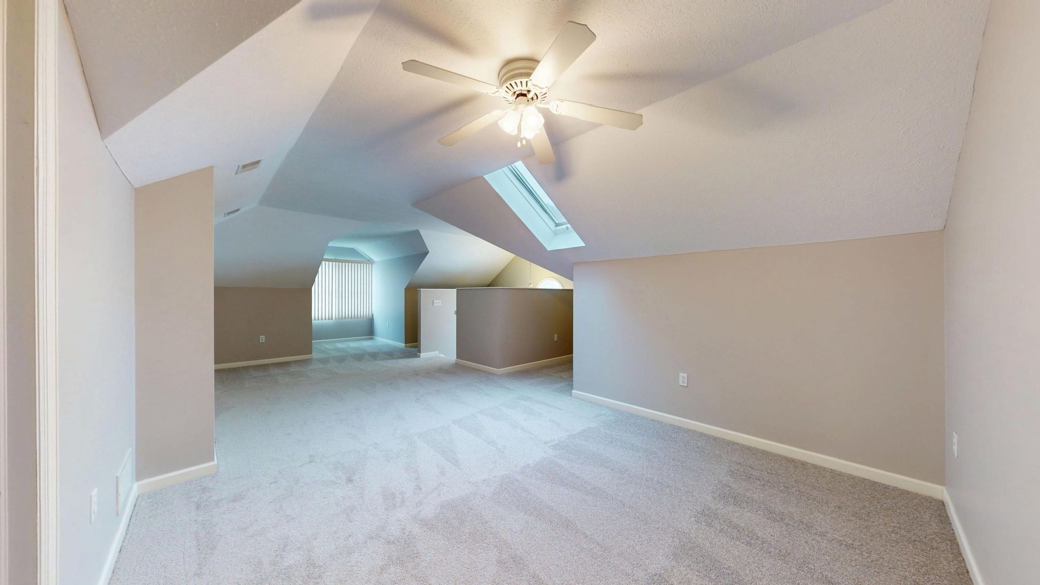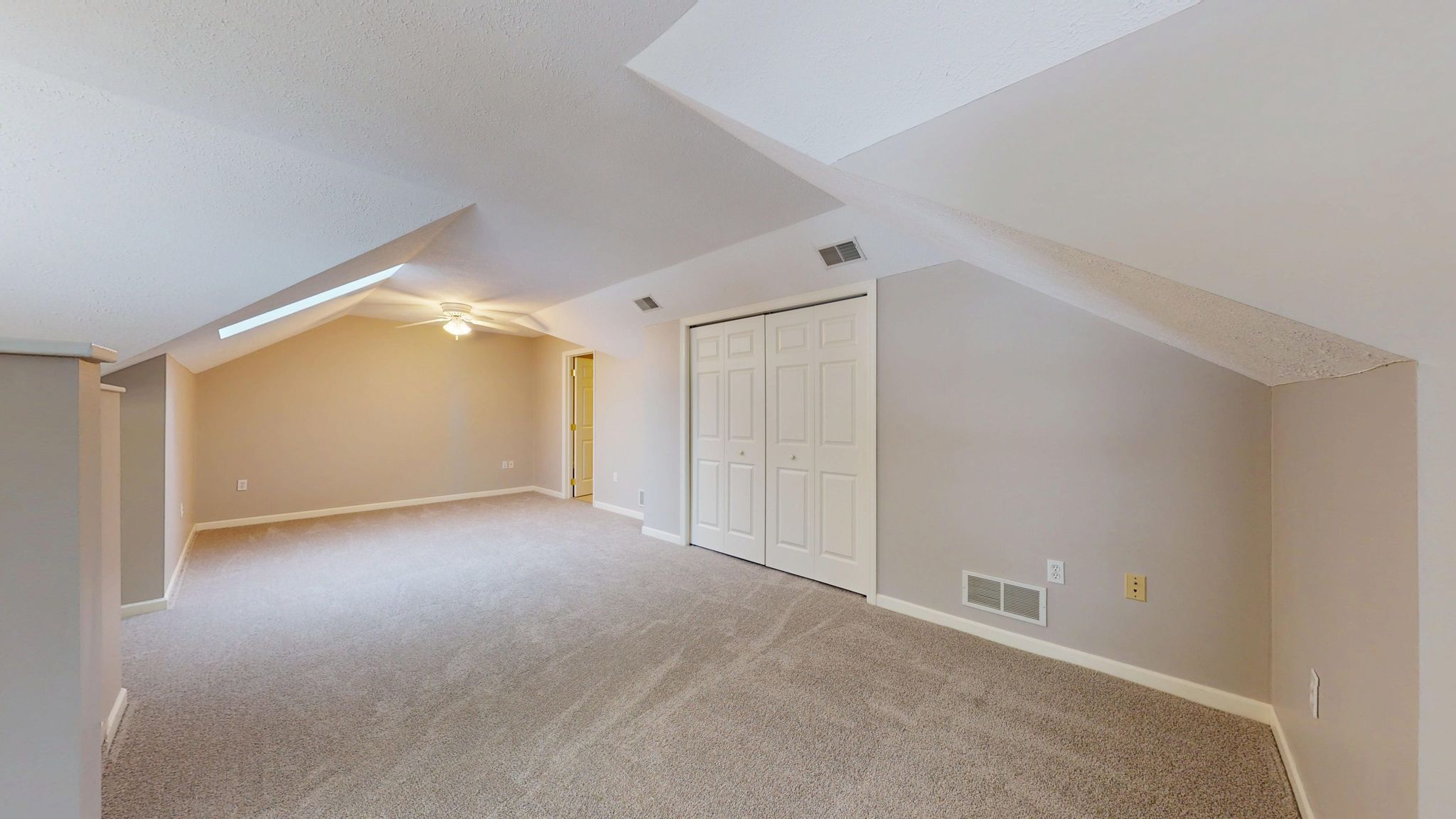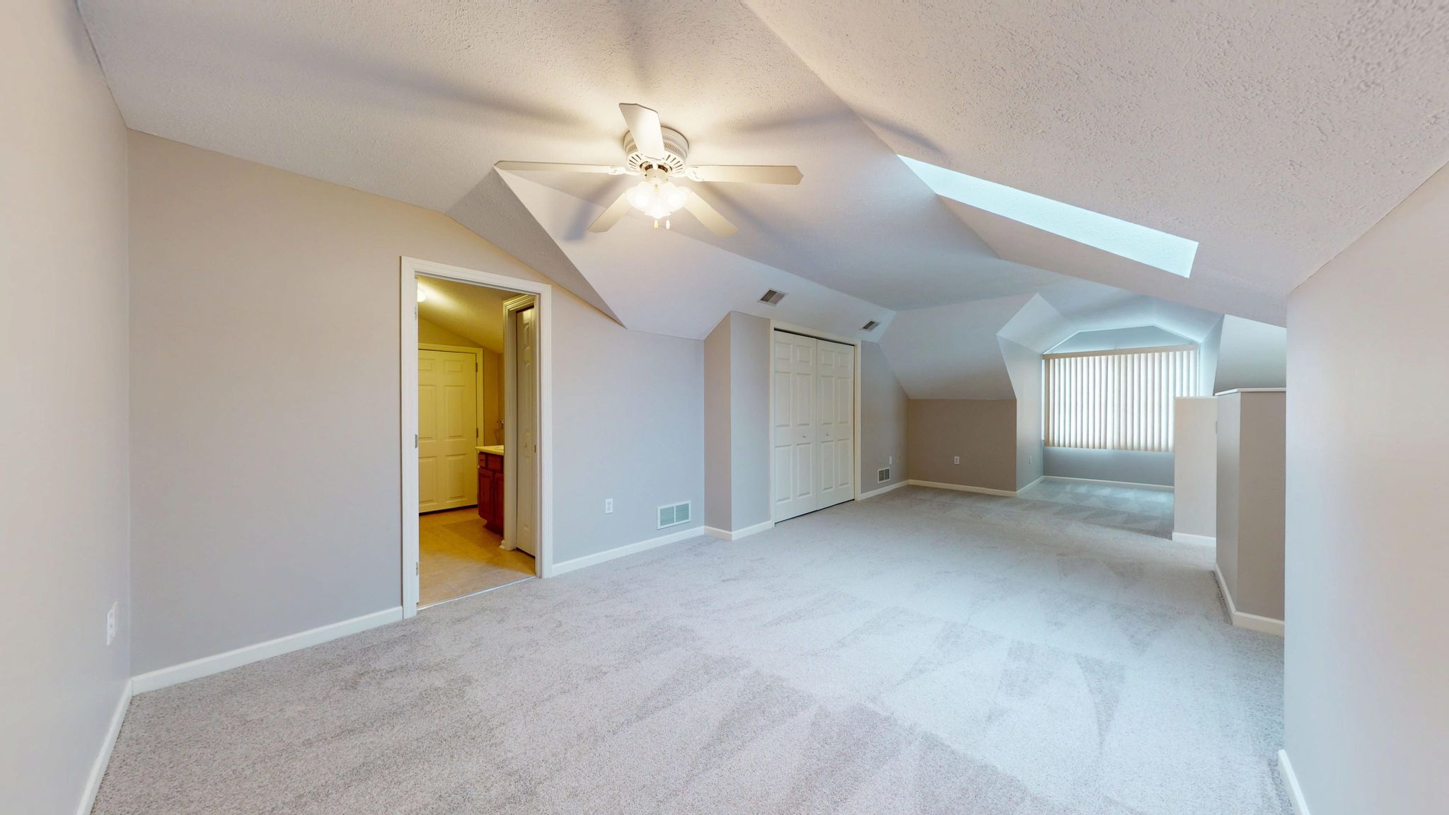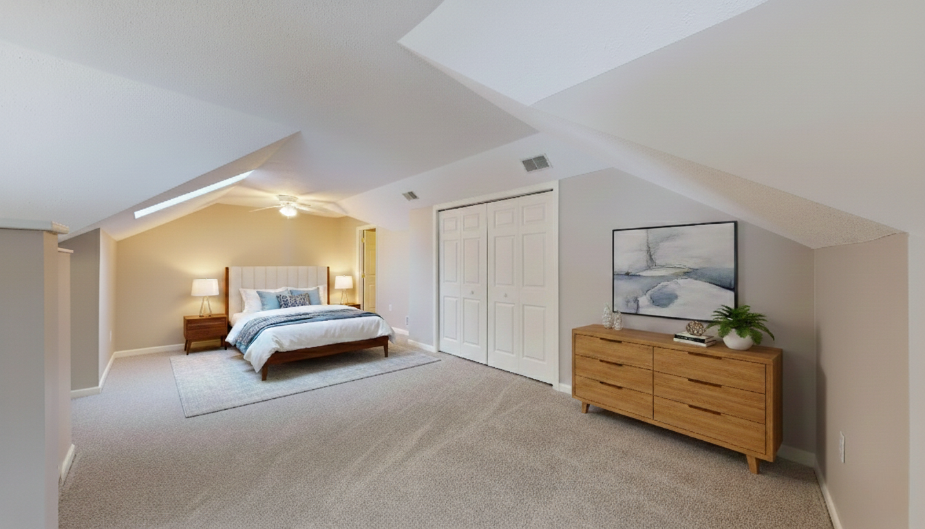The main-level primary suite offers a peaceful retreat with generous proportions, abundant natural light, and a custom-designed Elfa walk-in closet system. The en-suite bath includes a large vanity, step-in shower, and linen storage for added convenience. A secondary bedroom on the main level provides flexibility for guests, a home office, or a hobby room. Upstairs, vaulted ceilings and a skylight create a bright, versatile loft or third bedroom space, accompanied by a full bath—ideal for extended guests or a private work-from-home environment. A spacious walk-in attic with full standing room provides exceptional storage rarely found in similar homes.
