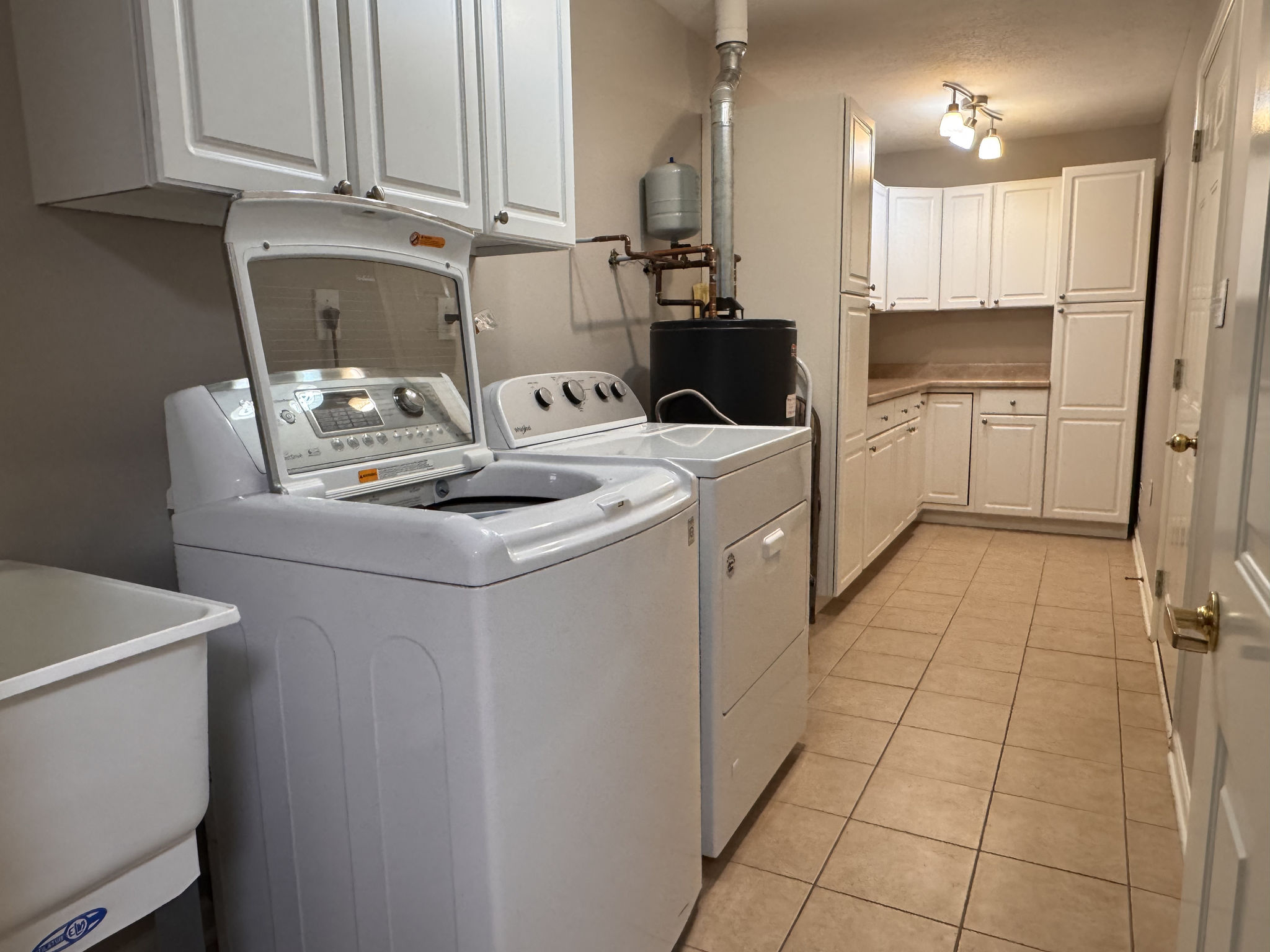 Daily routines are simplified with a spacious laundry room conveniently positioned between the kitchen and attached two-car garage. Featuring extensive cabinetry, pull-out storage drawers, counter space for folding, a utility sink, and a hanging rod, this well-appointed space was designed with organization in mind.