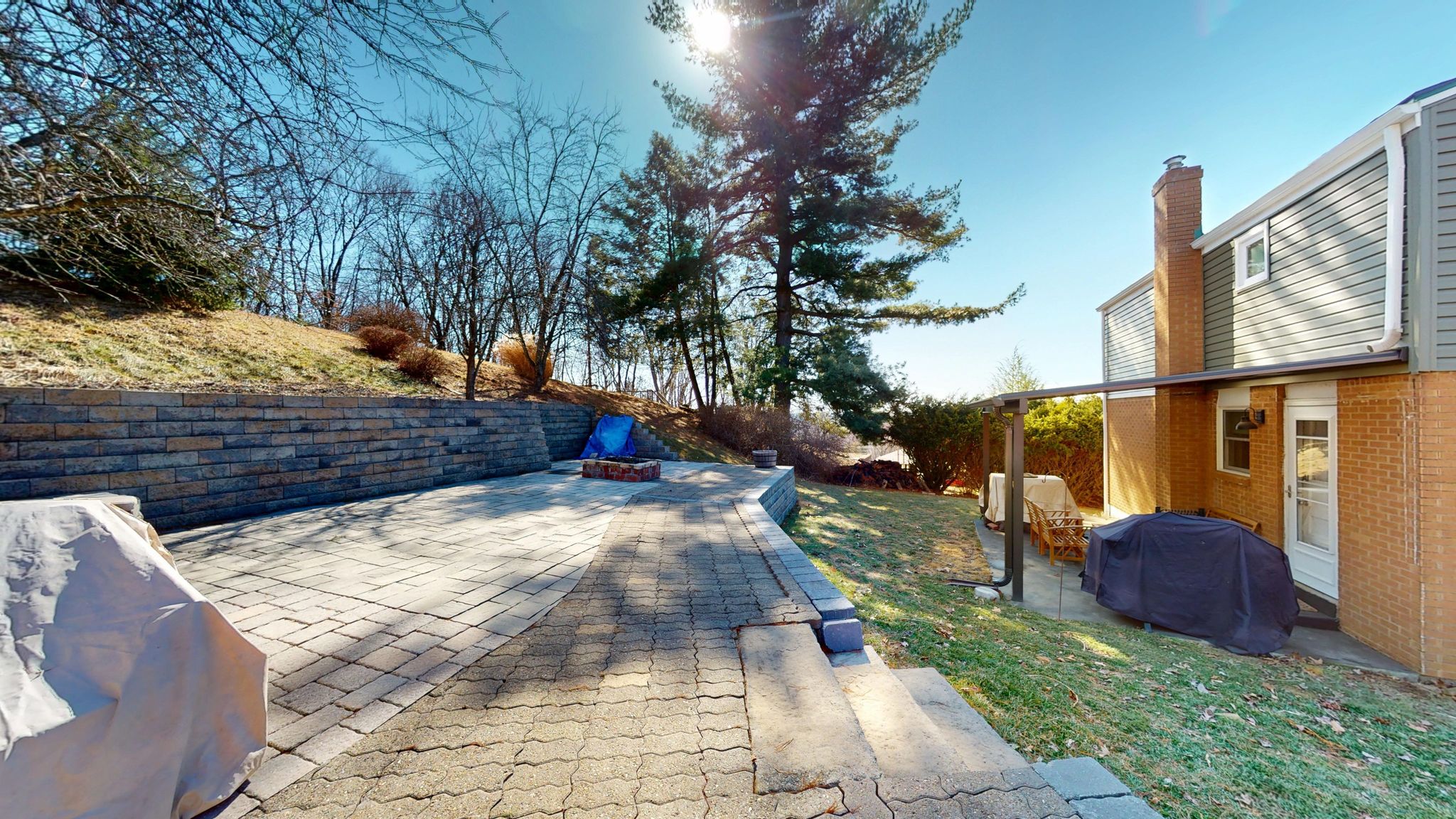The outdoor living space is a true highlight. A multi-level paver patio creates room for dining, relaxing, or gathering around a fire pit. The backyard offers sweeping views of downtown Pittsburgh, seasonal fireworks displays, and beautiful sunset skies. A covered patio area extends usability throughout the seasons, while terraced yard spaces provide opportunities for gardening or additional outdoor enjoyment.